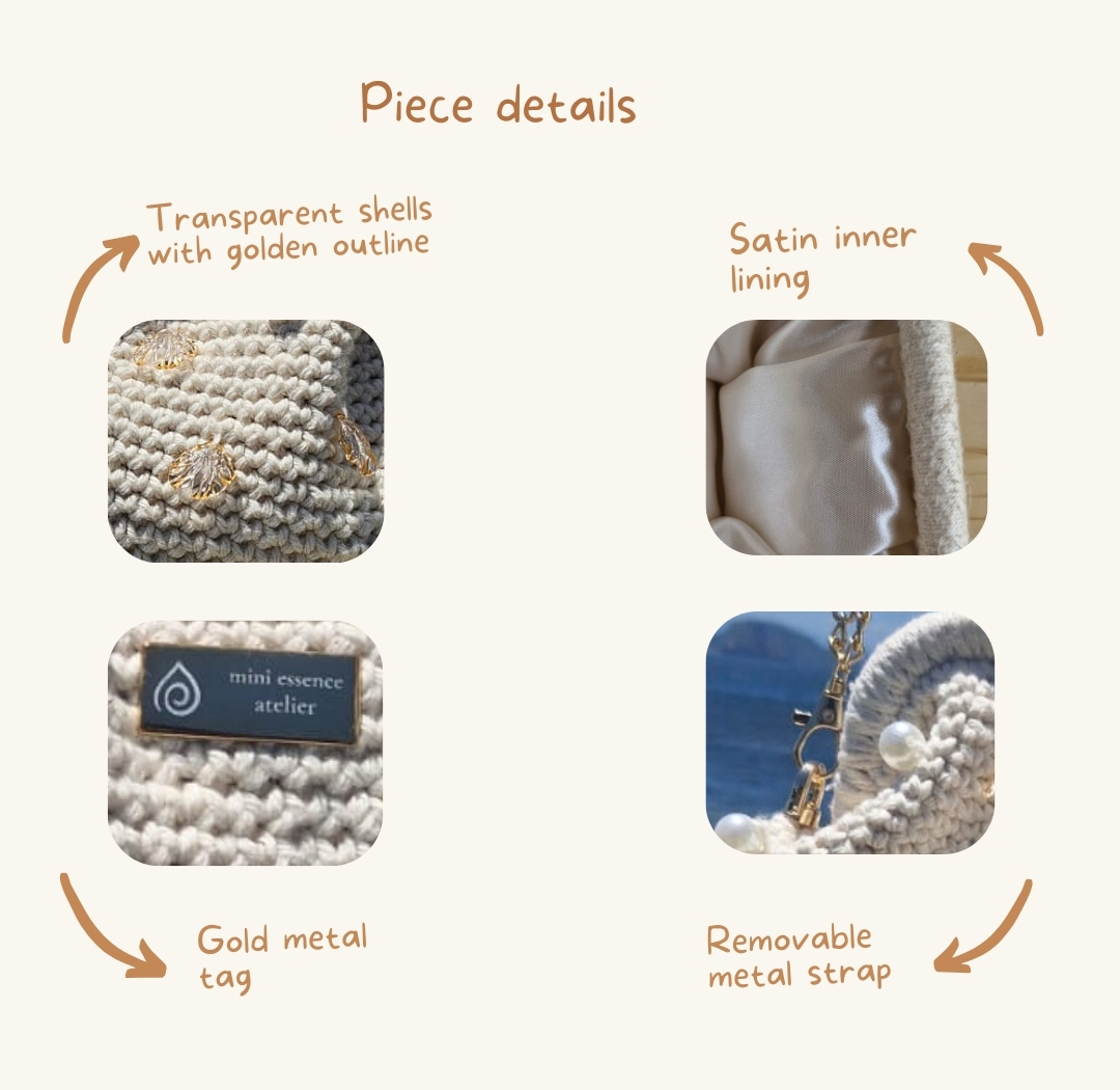 Inspired by the natural elegance of seashells and the gentle glow of pearls, the Sea Pearl Bag combines artisanal delicacy with timeless sophistication. Handcrafted in cotton crochet, it features subtle details of pearls and transparent shells with golden edges — a refined touch that captures the light like the shimmer of ocean waves.